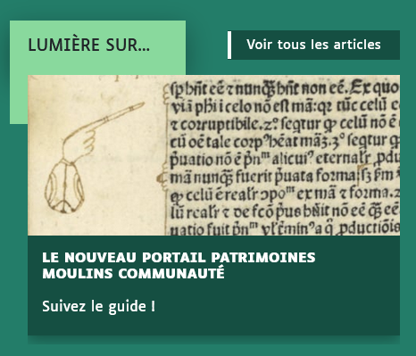 Lorsque le lien est sur fond vert, la page est située sur le portail Patrimoines Moulins Communauté.