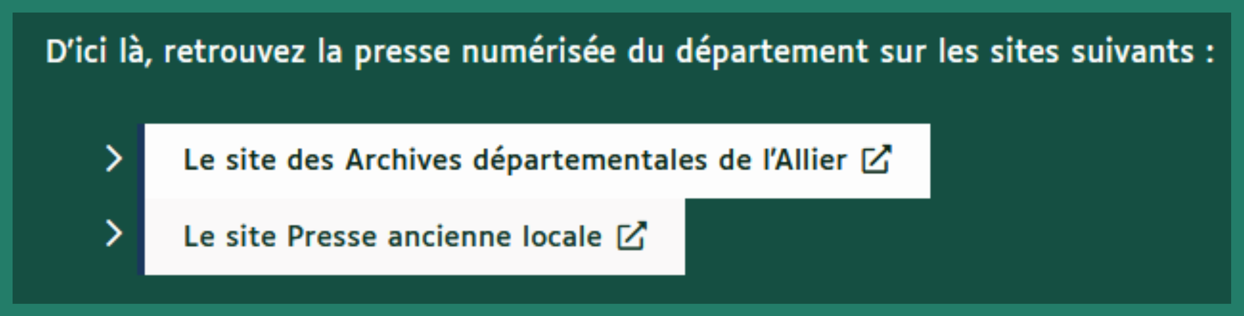 Lorsque le lien est sur fond blanc, la page est située sur un site externe et s'ouvrira dans un nouvel onglet.