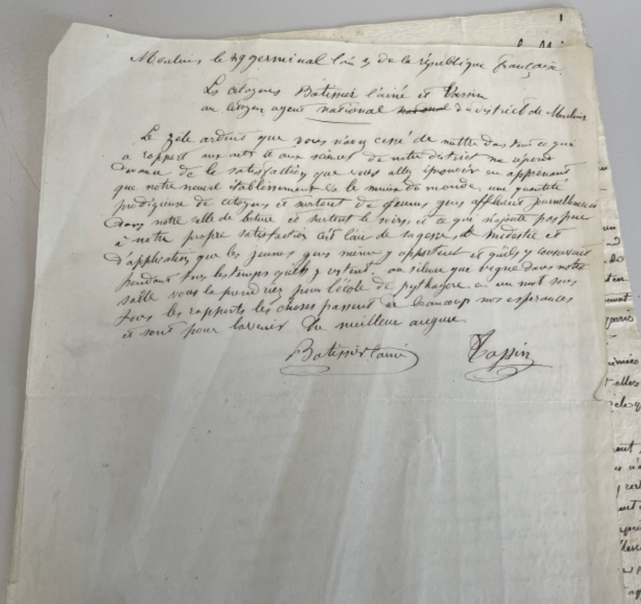 La bibliothèque de Moulins se forme d’abord par le dépôt littéraire. Le 29 germinal an III (le 18 avril 1795 avec le calendrier grégorien), une correspondance expédiée par Batissier, prêtre assermenté (1748-1807), et Tassin en charge de la surveillance du dépôt, atteste que celui-ci est ouvert et qu’il attire des lecteurs :