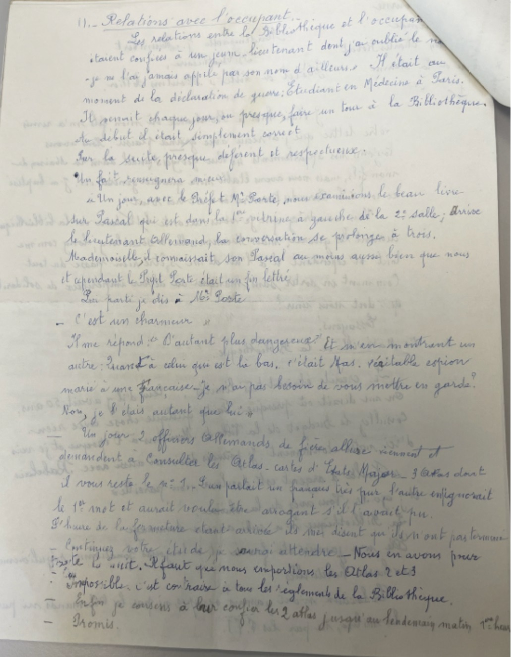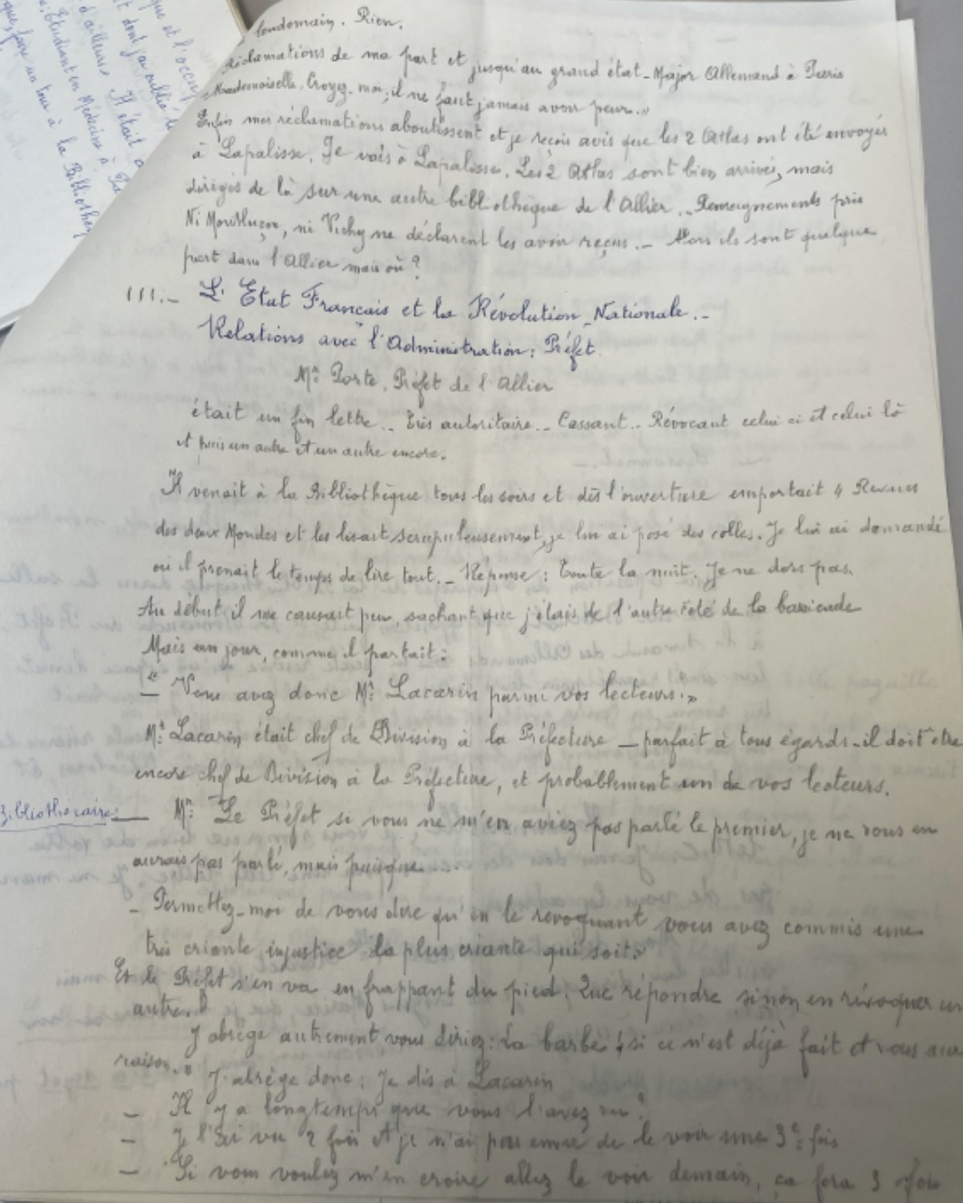 Concernant la bibliothèque de Moulins, celle-ci ne semble pas avoir été lourdement réprimée par les autorités allemandes, à l’exception d’un emprunt forcé de deux cartes d’État-major par deux officiers allemands. Celles-ci auraient été laissées à Lapalisse, mais elles n’ont pas pu être retrouvées. Le bibliothécaire d’alors, Monsieur Rigal, donne un résumé de l’existence de la bibliothèque à cette période suite à une demande de Jacqueline Humbert, bibliothécaire en 1962, qui le sollicite pour une étude menée par le Comité d’Histoire de la Deuxième Guerre mondiale. Il répond à la lettre dans un questionnaire préparé par le Comité dont voici un extrait :